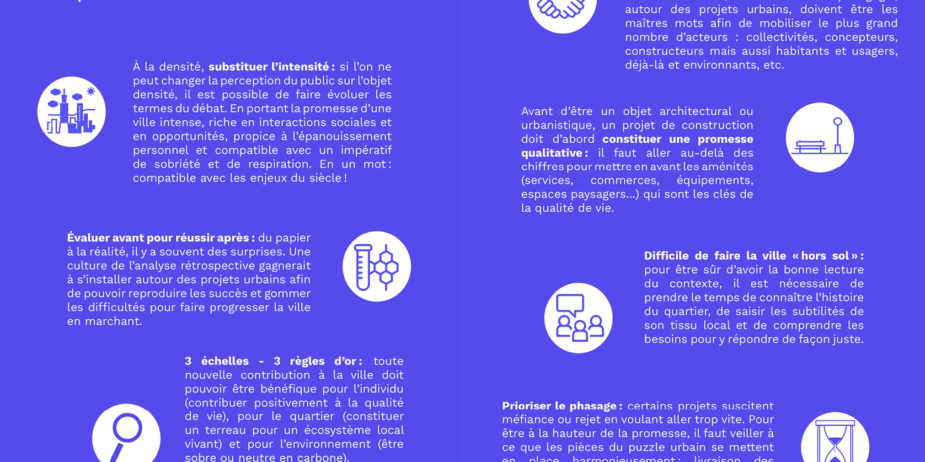 Nous l’avons vu, la densité est régulièrement associée à un florilège de « faux amis » qui véhiculent une connotation péjorative. Pour espérer s’en débarrasser, il faut réinvestir le terrain du langage pour faire rimer densité avec l’ensemble des phénomènes positifs qu’elle génère pour la ville. Ce cercle vertueux peut être nommé intensité ! Ouvrage…